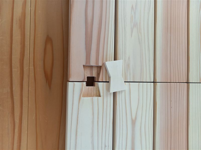 分割されたマットの連結には、ボルトやネジでは無く、普段使いしやすいよう蝶々(ちぎり)を採用。