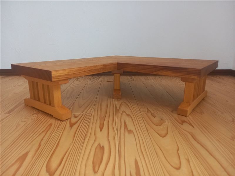 なお、3本の脚は床面の傾斜を考慮しそれぞれ長さを変えて作ってはいますが、ぐらつかぬよう床面に合わせ調整加工するには時間がかかるだろうと危惧していた脚裏の加工。ところが制作前にレベル測定器で確認していたことが功を奏したのでしょう、設置時に(なぜか?)天板レベルがしっかり出ており、しかもどこに乗ってもガタつくどころかビクともしなかったため、無加工でそのままOKを頂くこととなりました。