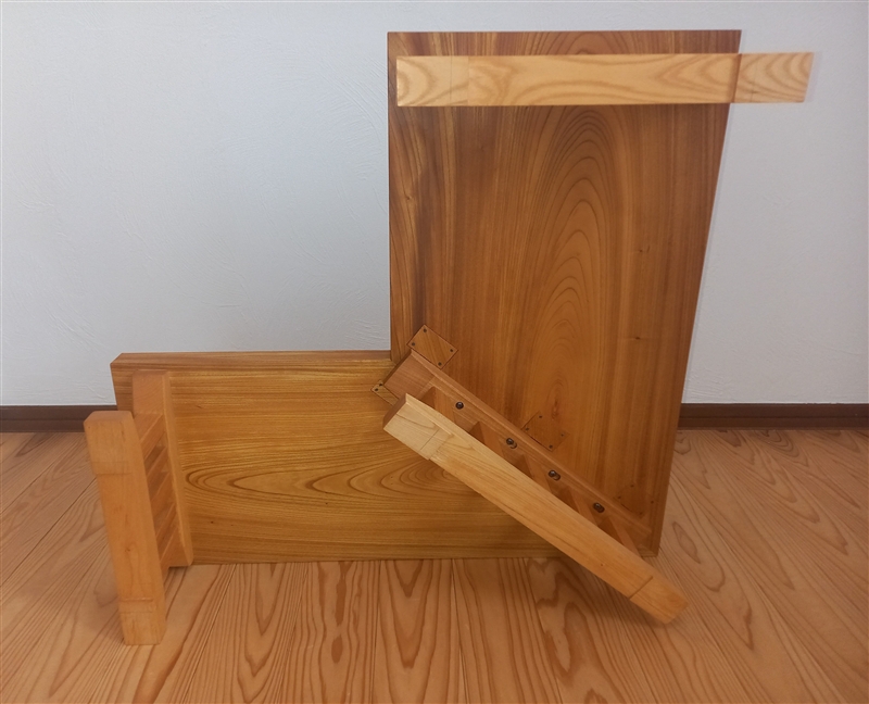試行錯誤の結果、脚は3本とし、両端に1本ずつ、そして2枚の板を合わせた留め加工の下に中央の脚を設置することに。